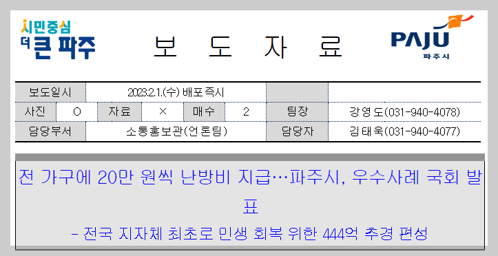 2월 1일 보도자료에 의하면 전 가구에 20만 원씩 난방비를 지급할 예정이라고 합니다. 전국의 지자체 최초로 444억의 추경을 편성하였고 파주시에 주소를 둔 모든 가구에 에너지 생활안정지원금 지급을 결정하였다고 합니다. 따라서 약 20만 가구가 혜택을 볼 것으로 보입니다.