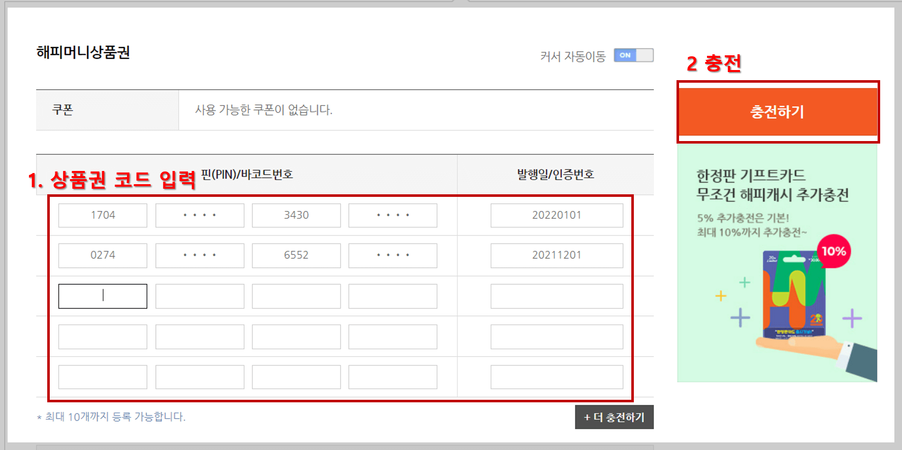 4. 상품권 앞면 스크래치 부분을 긁어 나오는 상품권 코드와 발행일을 아래와 같이 입력하시고 충전하기 버튼을 클릭합니다. (저는 5천 원 권 2장, 총 1만 원을 충전했어요.)