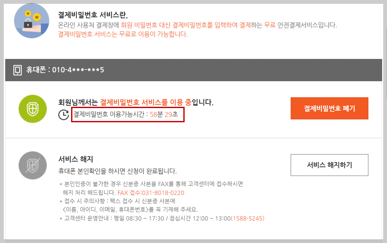 7. 저는 예전에 등록을 한 기록이 있는데, 안되어있는 경우엔 결제비밀번호 서비스(무료) 이용 절차를 진행 후, "결제비밀번호 받기"라고 적힌 빨간색 버튼을 클릭합니다.