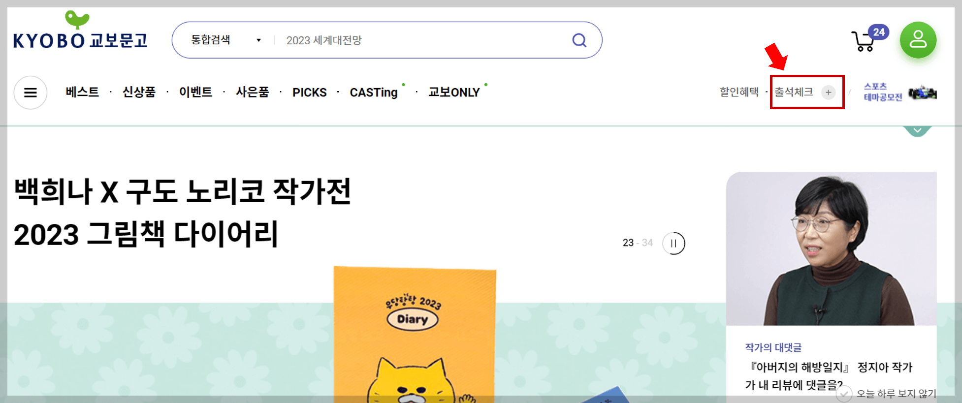 1. 교보문고 웹사이트에서 로그인한 뒤, 출석체크를 클릭해주세요.